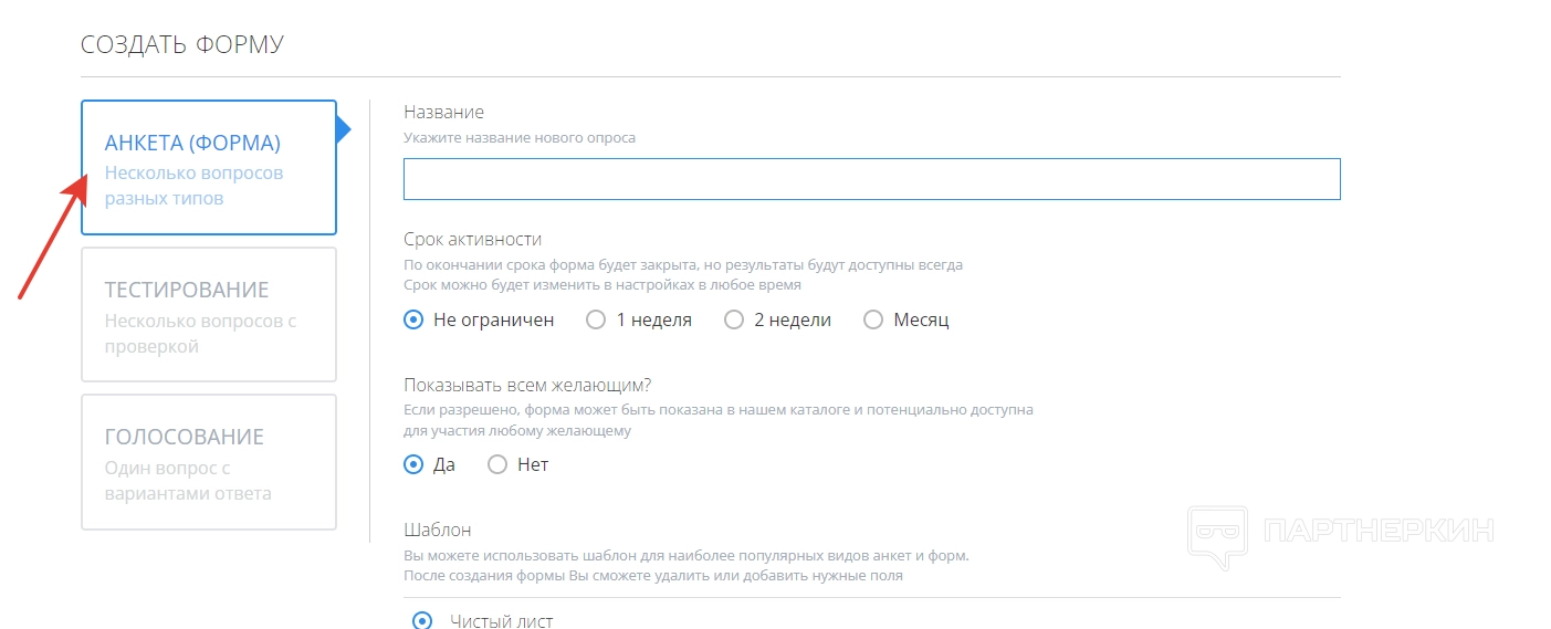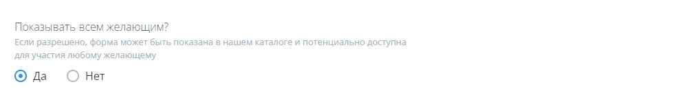 Далее нужно определиться с тем, будет ли анкета показываться всем желающим. Если пользователь даст разрешение, форма будет показываться в каталоге сервиса и станет доступна всем желающим.