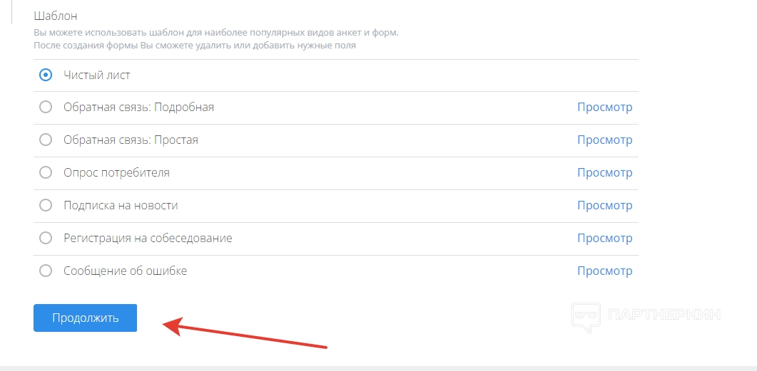 Выбрав, допустим, вариант, «Опрос потребителя», жмем на кнопку «Продолжить».