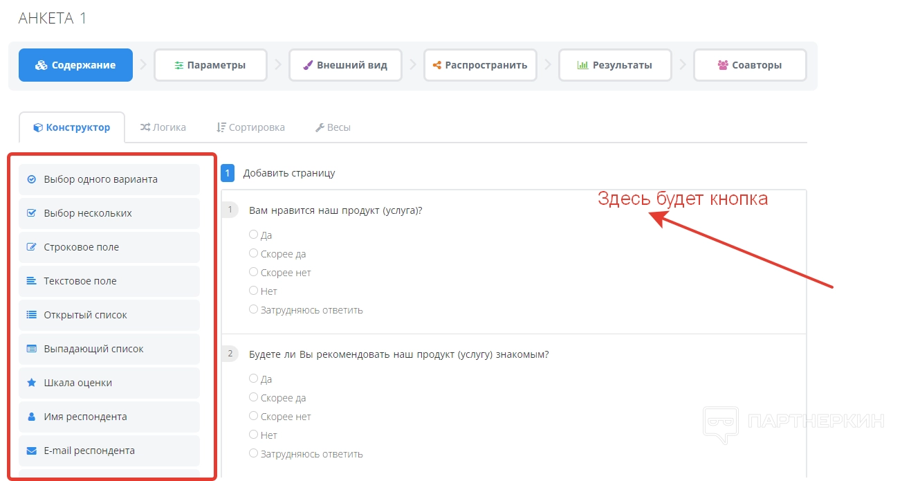 На новой странице откроется панель с разными разделами для настройки анкеты. В разделе «Содержание» пользователь может редактировать вопросы и варианты ответов. Для этого используем кнопку «Редактировать», которая появляется напротив названия вопроса. Учтите, инструменты из левой колонки доступны на платных тарифах.