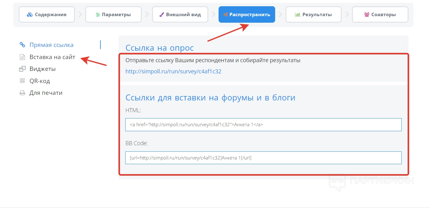 Далее идет раздел «Распространить», где пользователь найдет ссылку на созданную анкету. Также там есть ссылки в виде кода для вставки на форумы и в блоги. Если нужно получить код для вставки на сайт, переходим в соответствующую вкладку и копируем HTML. Также для распространения можно использовать виджеты и QR-код.