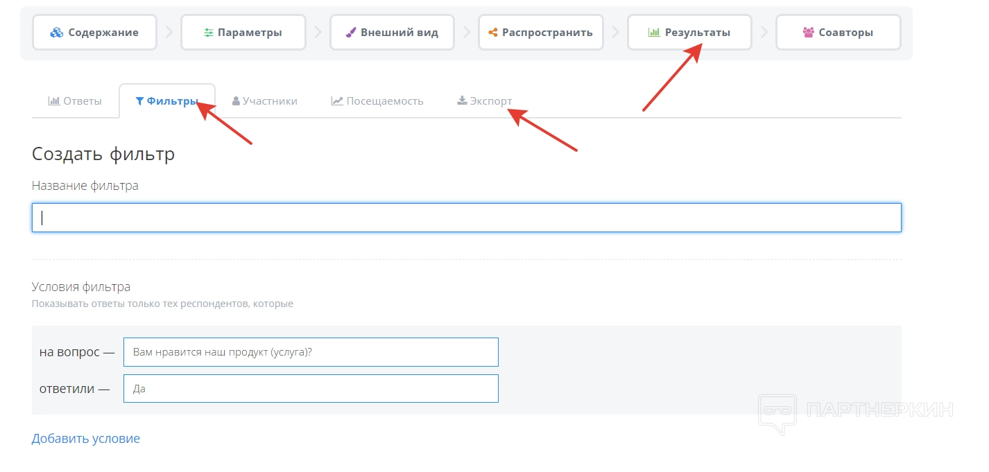 В разделе «Результаты» пользователь найдет количество ответов на вопросы из анкеты. Во вкладке «Фильтры» можно создать фильтр, который будет обирать тех респондентов, которые дали конкретный ответ на конкретно выбранный вопрос. Результаты можно экспортировать, используя соответствующий инструмент.