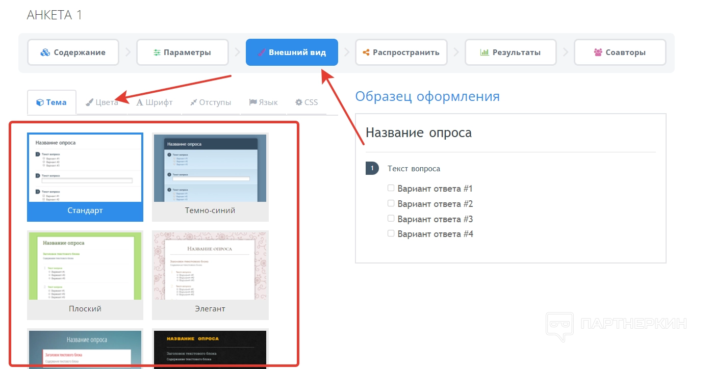 В разделе «Внешний вид» происходит настройка визуальной части формы. При желании можно использовать подготовленные шаблоны или собственные наброски из вкладки «Цвета». Во вкладке «Язык» можно выбрать язык, на котором будут отображаться кнопки в анкете.