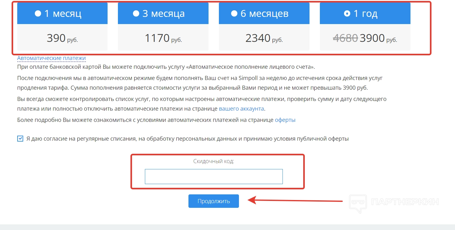 В отдельной строке указываем скидочный код (если есть) и жмем «Продолжить».