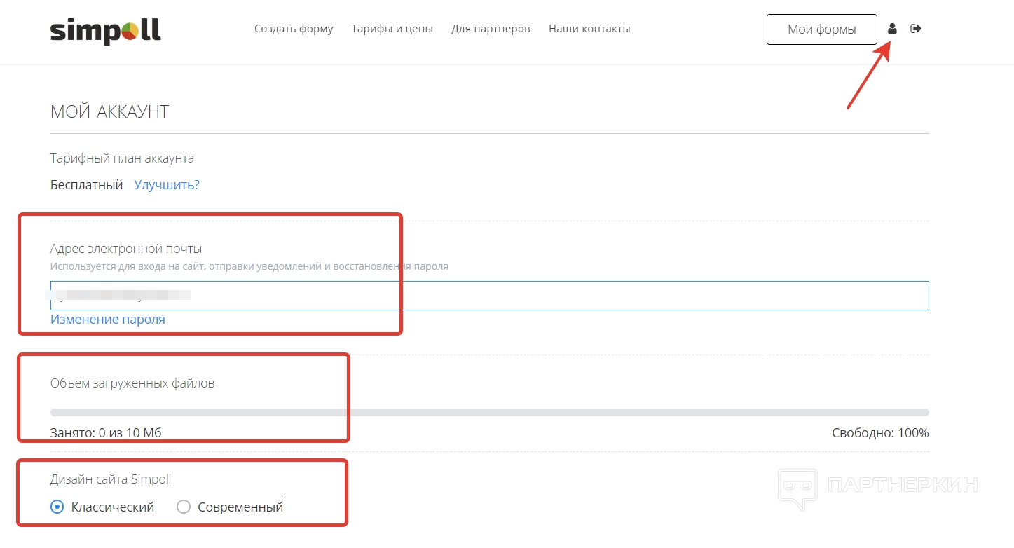 Чтобы попасть в настройки, кликаем на значок с человечком в правом верхнем углу. Откроется страница, где можно изменить электронную почту, пароль и дизайн сайта. Также там будет отображено количество памяти, соответствующее выбранному тарифу.