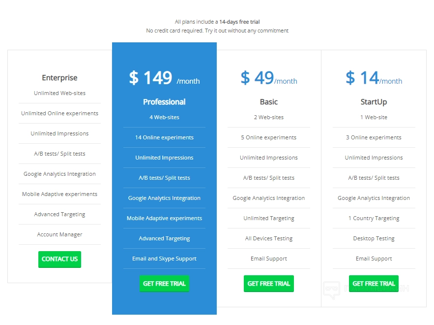 - Professional — 149 долларов в месяц — 4 веб-сайта в работе, до 14 экспериментов одновременно, а также более точечная настройка таргетинга и части других функций.