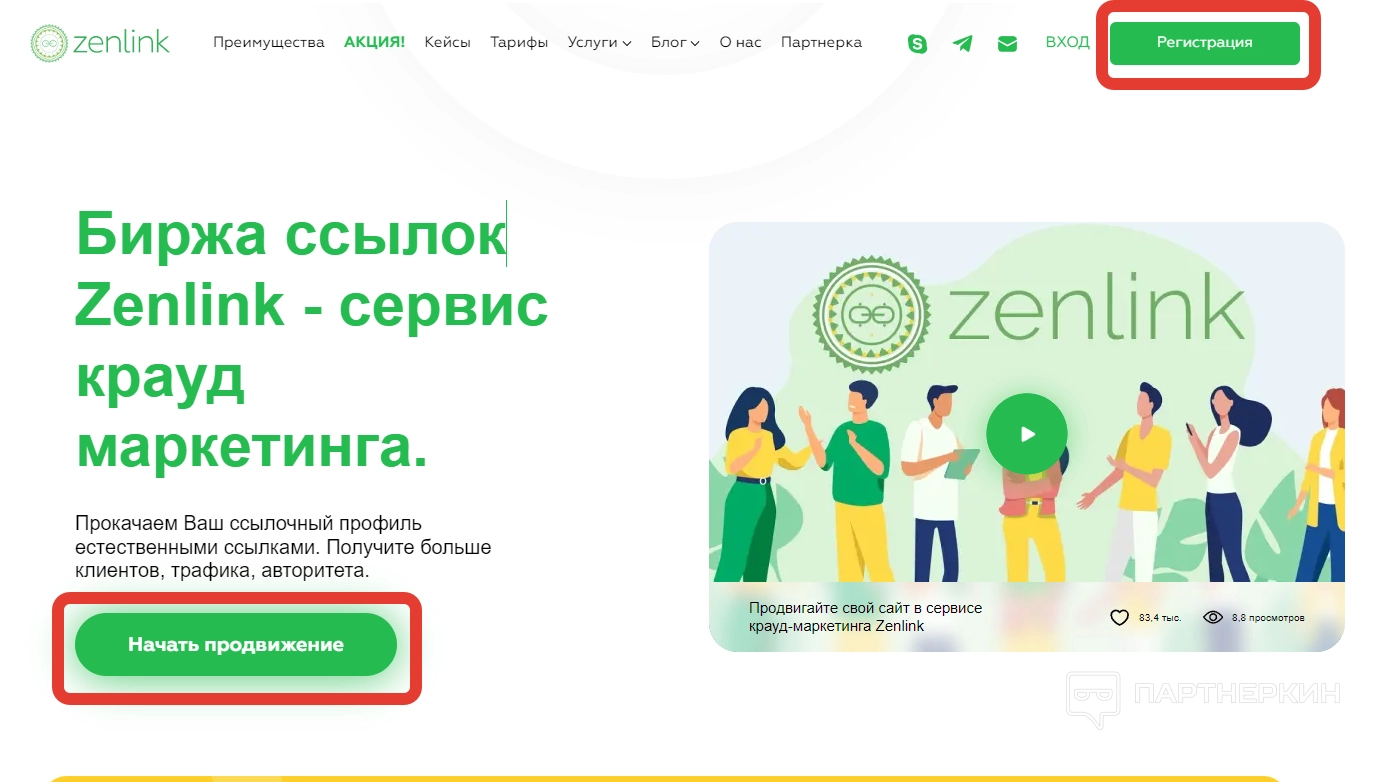 Чтобы протестировать функциональные возможности сервиса, необходимо создать учетную запись. Сделать это достаточно просто. В первую очередь заходим на главную страницу сайта, после чего жмем на кнопки «Регистрация» или «Начать продвижение».