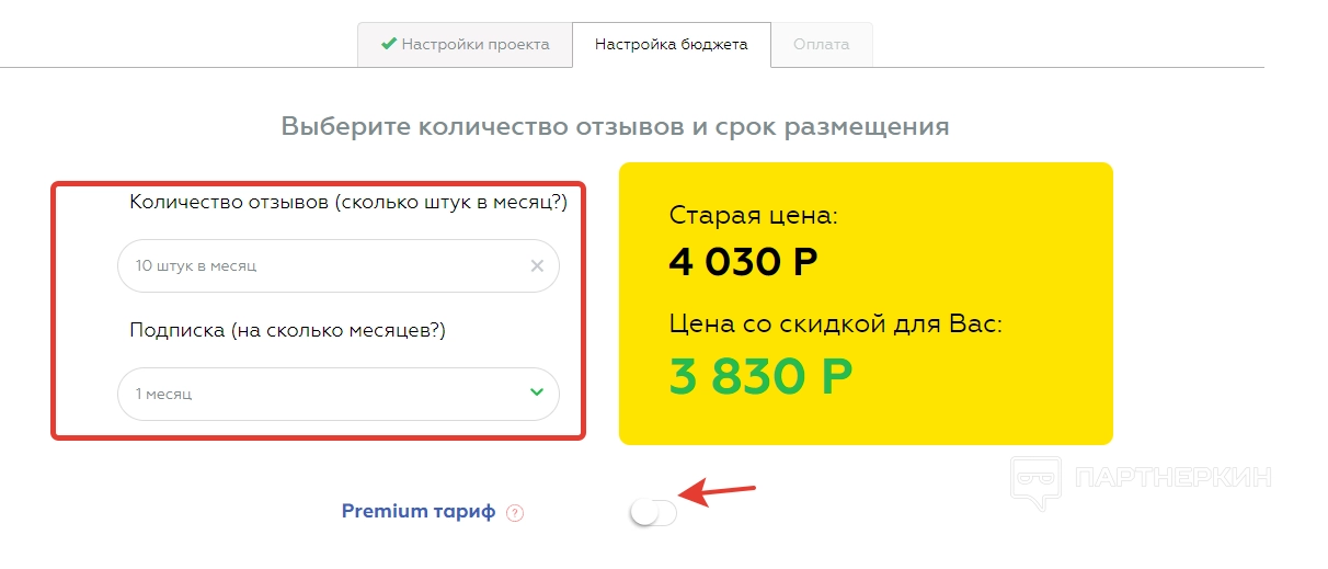 Теперь нужно настроить параметры бюджета. В первую очередь количество отзывов: от 10 до 50 штук в месяц. Далее выбираем срок подписки: от 1 до 3 месяцев. Также можно воспользоваться премиум-тарифом, о котором расскажем чуть ниже.