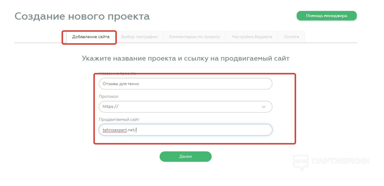 Когда пользователь выберете подходящий вариант, откроется форма, заполнение которой состоит из нескольких этапов. На первом этапе нужно указать название проекта, протокол (HTTP или HTTPS) и ссылку на сайт.