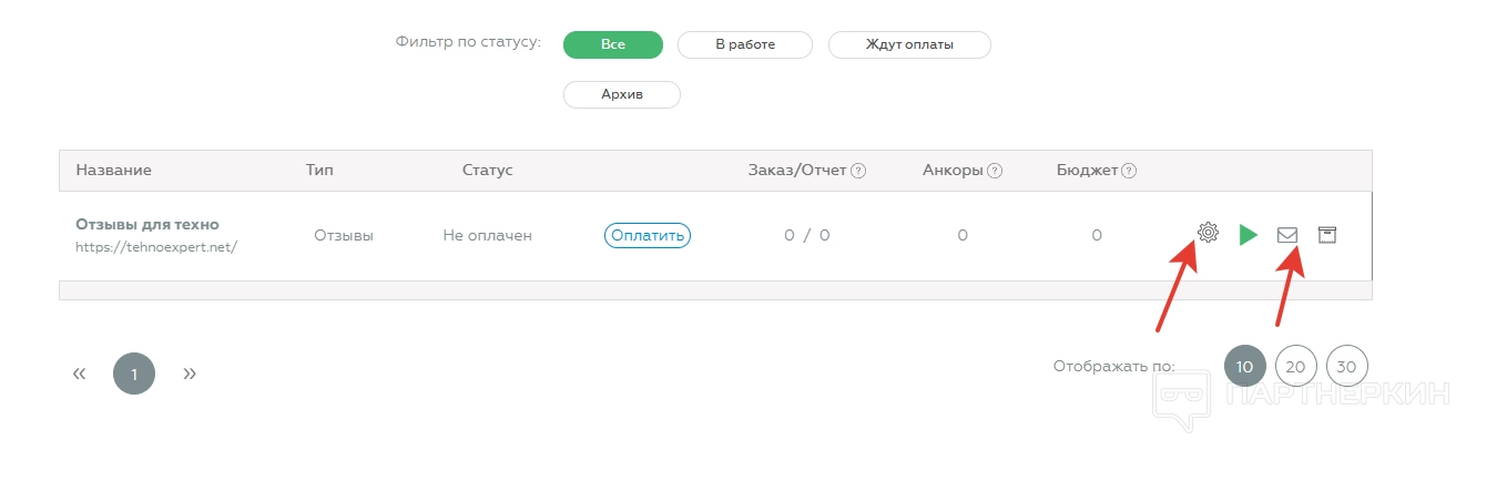Вебмастер может в любое время изменить настройки проекта. Для этого нужно кликнуть на шестеренку в строке с проектом. Рядом есть значок в письмом, который откроется доступ к чату.