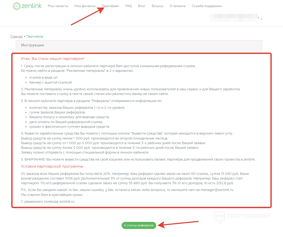 Чтобы получить сведения о партнерской программе, переходим в раздел «Партнерам». Тут же откроется страница, где юзер найдет расписанные особенности программы для привлечения рефералов. Обращаем внимание на кнопку «К списку рефералов» в нижней части страницы, с помощью которой можно попасть в кабинет самой партнерки.