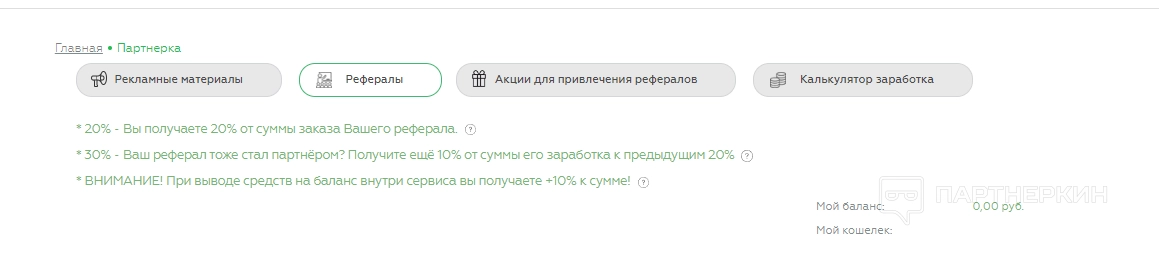- рефералы — вкладка со статистикой, балансом партнерки и историей выплат;