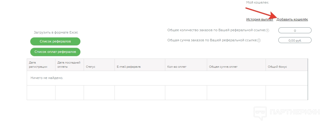 Прежде чем вывести заработанные на рефералах средства, владелец аккаунта должен добавить реквизиты. Для этого жмем на кнопку «Добавить кошелек» над таблицей со статистикой и выбираем подходящий вариант (Сбербанк или ЮMoney).