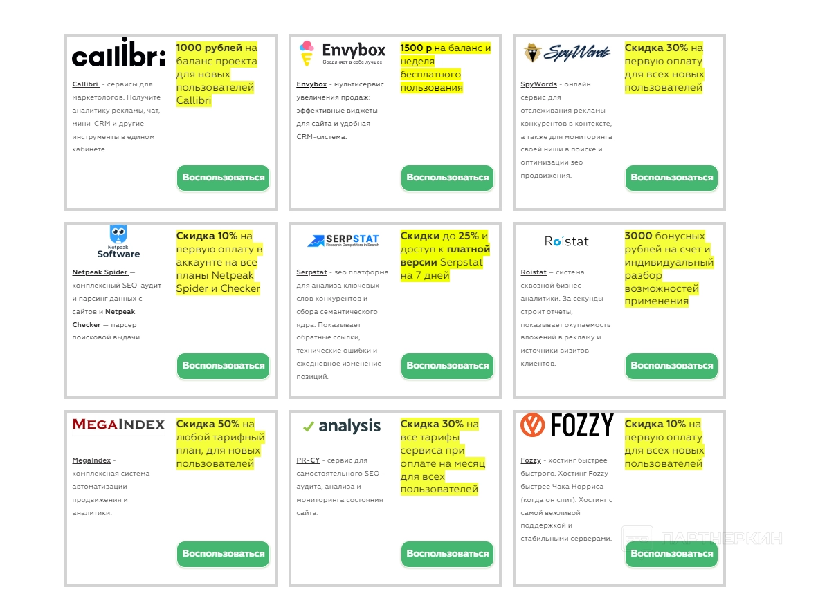 - скидка 30% на первую оплату для всех новых пользователей в сервисе SpyWords;