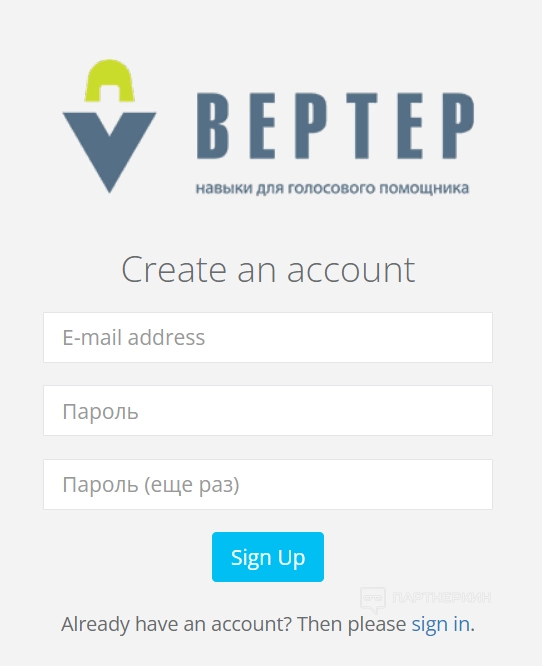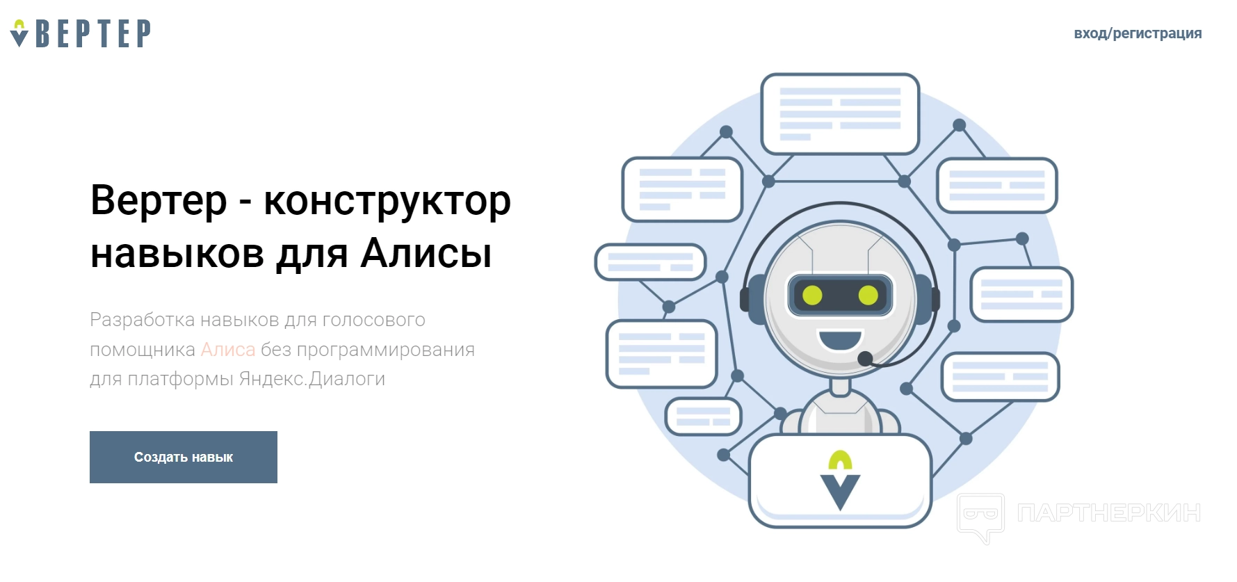 Чтобы начать работу с проектом, достаточно перейти на официальный сайт проекта (Вертер) и нажать на кнопку «Создать навык», либо «вход/регистрация» в правом верхнем углу экрана. Помимо этого, можно ознакомиться с содержимым лендинга — информации не так много, но в целом достаточно, чтобы понять смысл сервиса.