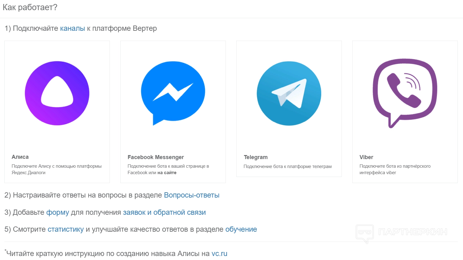 Другое дело, что с недавних пор появилась возможность произвести интеграцию и с другими сервисами — Алисой, Фейсбуком, Telegram, а также Viber. Бот будет нести скорее информационный характер, можно использовать его как автоматизатор FAQ, либо возможность выдать лид-магнит и сформировать корзину с помощью формы.