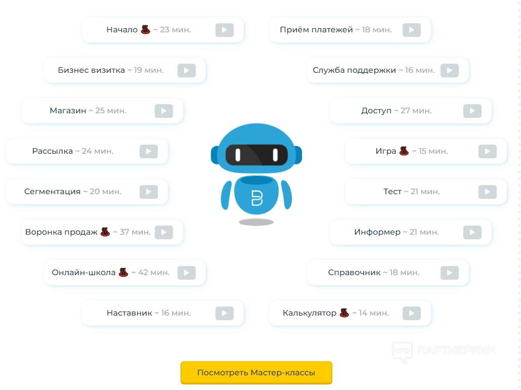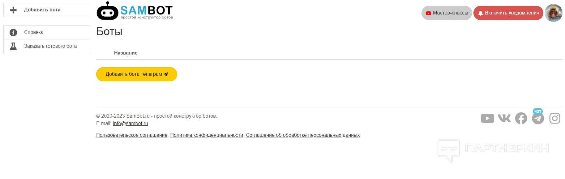 - Сразу после перехода по ссылке открывается рабочая панель — меню «прячется» за иконкой пользователя в правом верхнем углу. Система сразу же предлагает создать бота самостоятельно, либо заказать готовое решение от разработчиков. Помимо этого, можно просмотреть мастер-классы (они были представлены также на главной странице).