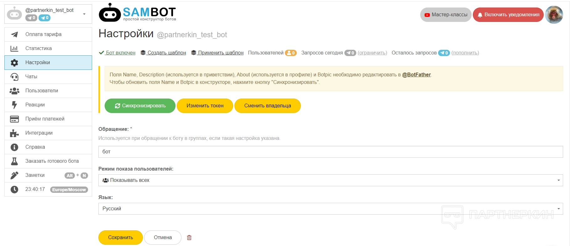 После добавления бота рабочая панель серьезно преображается — появляется дополнительный (ранее скрытый) функционал, возможность применения шаблонов и обращения к статистике. В базовой версии можно обработать всего 0 запросов, но тестовый режим без ограничений включается достаточно просто.