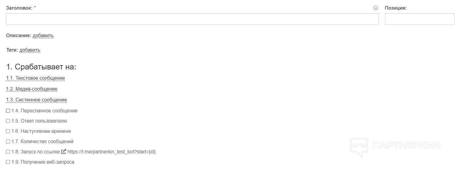 Вторая категория для настройки — реакции. Это умение бота реагировать на то или иное событие — к примеру, если к нему кто-то обратится, будет выполнено нежелательное действие, или нужно будет разрядить обстановку рассылкой. Отчасти по этой причине владелец платит не за количество чатов, а за количество обрабатываемых сообщений. Реакций можно добавить неограниченное количество при необходимости.