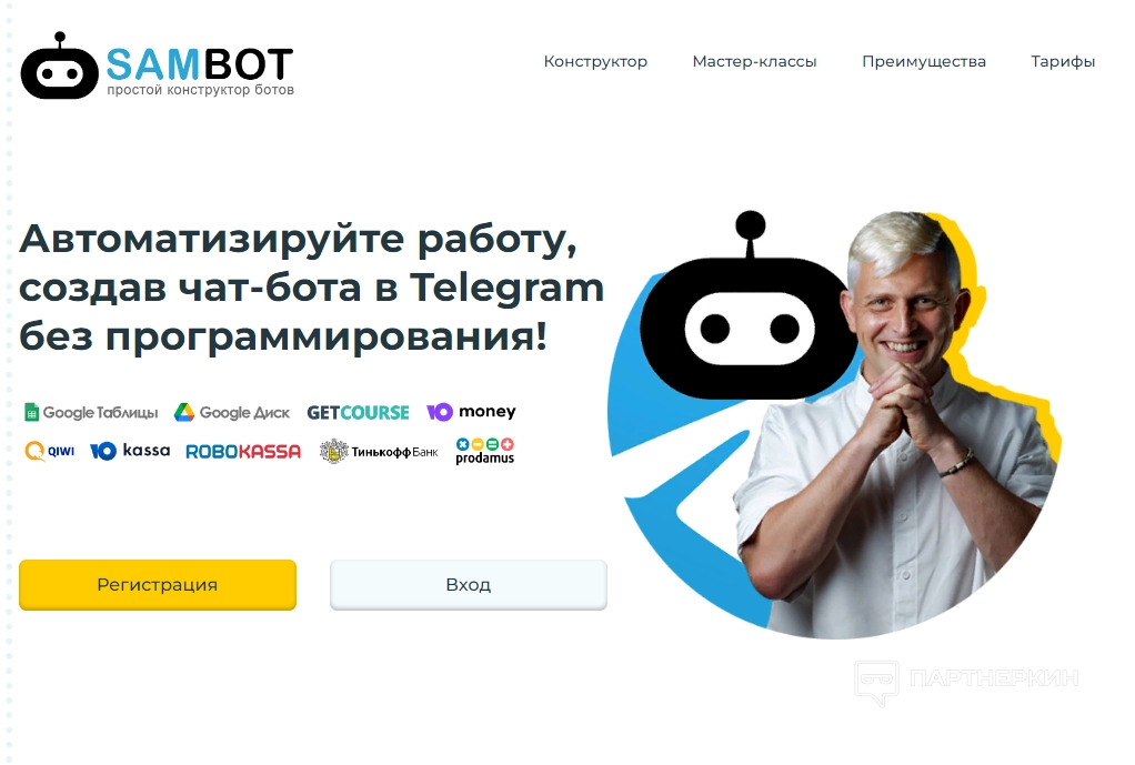 - Перейти на официальный сайт проекта (http://sambot.ru/), нажать на кнопку «Регистрация». Между делом можно узнать, что у получаемых чат-ботов есть много возможностей для интеграции, а сама работа в конструкторе может занять не более 30 минут.
