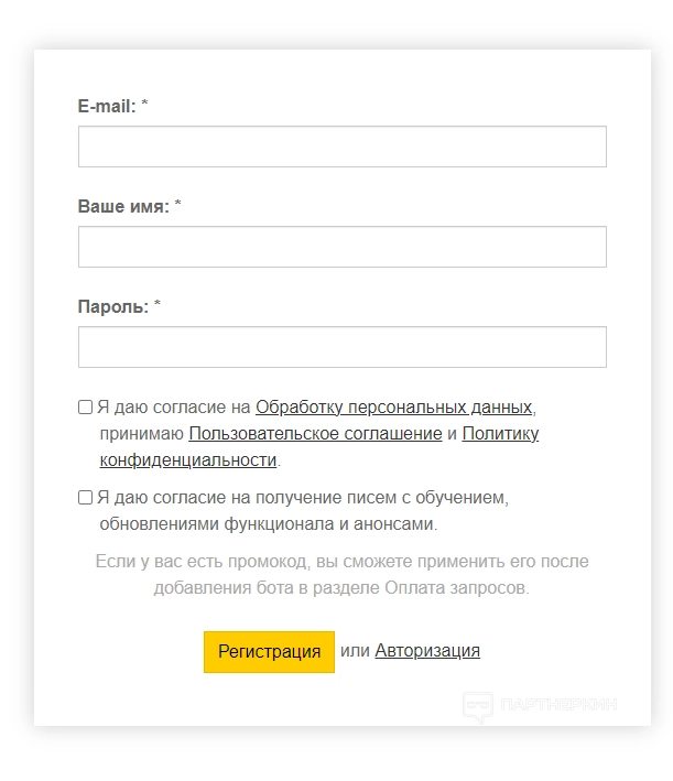 - Далее потребуется ввести информацию о себе — актуальный адрес электронной почты, имя, а также придумать пароль для авторизации. Помимо этого необходимо согласиться с политикой обработки персональных данных, пользовательским соглашением и политикой конфиденциальности. При желании можно заранее не подписываться на рекламную рассылку.