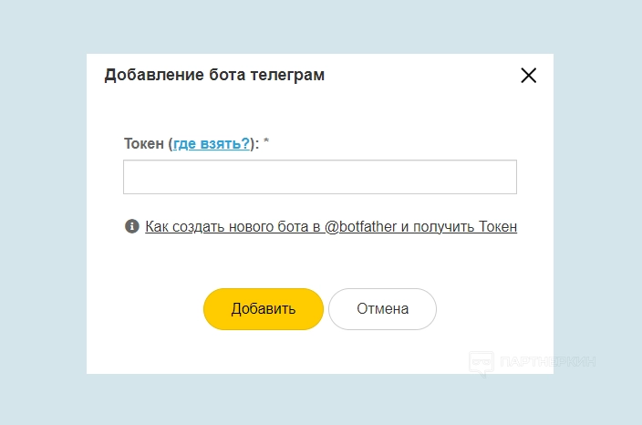 Сразу после этого можно приступать к формированию чат-бота — необходимо нажать на кнопку «Добавить бот телеграм», а после ввести токен, полученный от BotFather. Если появились затруднения с его получением, можно воспользоваться сразу двумя инструкциями с видеосопровождением.