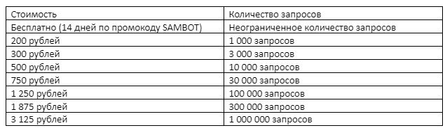 Данные тарифы подразумевают абонементную основу — то есть, бот подключается на ограниченный срок (количество дней), и обрабатывает указанное количество сообщений (количество запросов). Подходит для ситуаций, когда требуется помощь робота в долгосрочной перспективе, и есть уверенность, что в одни дни в чате появляется 0-50 сообщений, а в другие — 950-999, например.