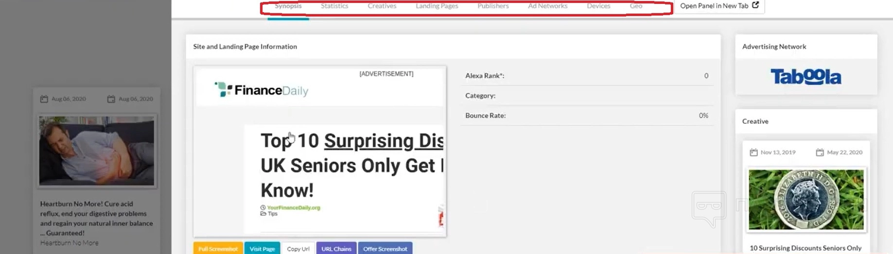 - «Сводка». Первая вкладка по умолчанию, на которой можно видеть изображение, текст объявления, предпросмотр целевой страницы, страну (или страны), где показывается объявление, рекламную сеть и другую информацию. Здесь можно проверить цепочки URL-адресов объявления и кнопку «Загрузить и развернуть».