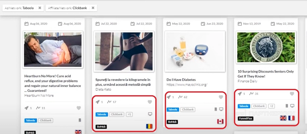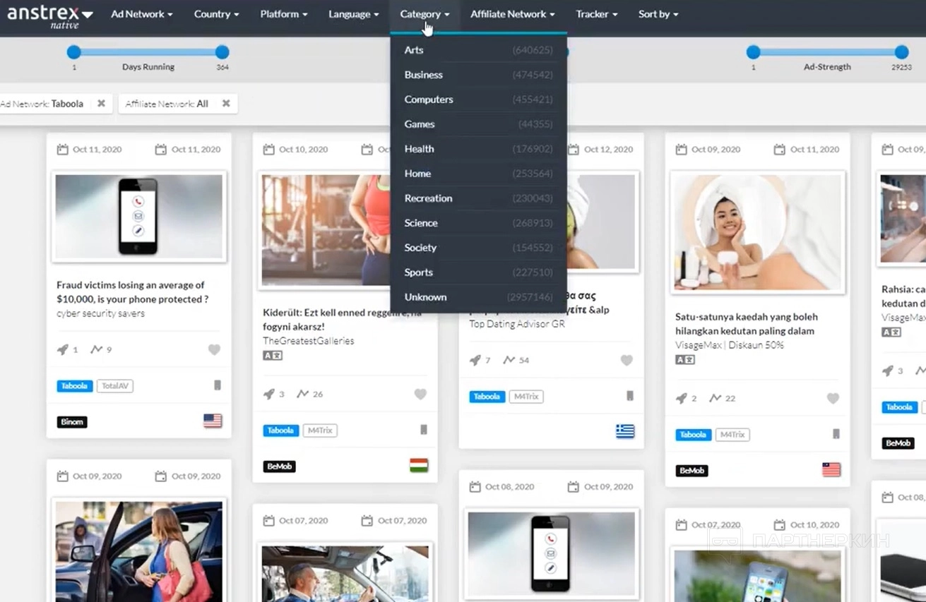 Можно быстро отфильтровать и найти рекламу, используя фильтры: рекламная сеть, категория, страна, устройство, партнерская сеть, инструменты отслеживания и другие. Рекламу можно сортировать по популярности, продолжительности, дате и иным параметрам.