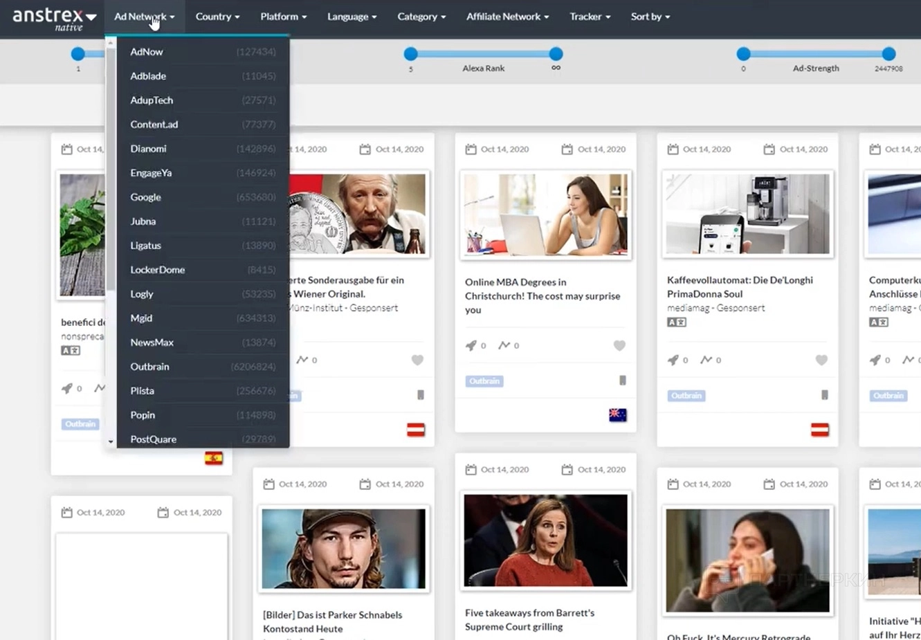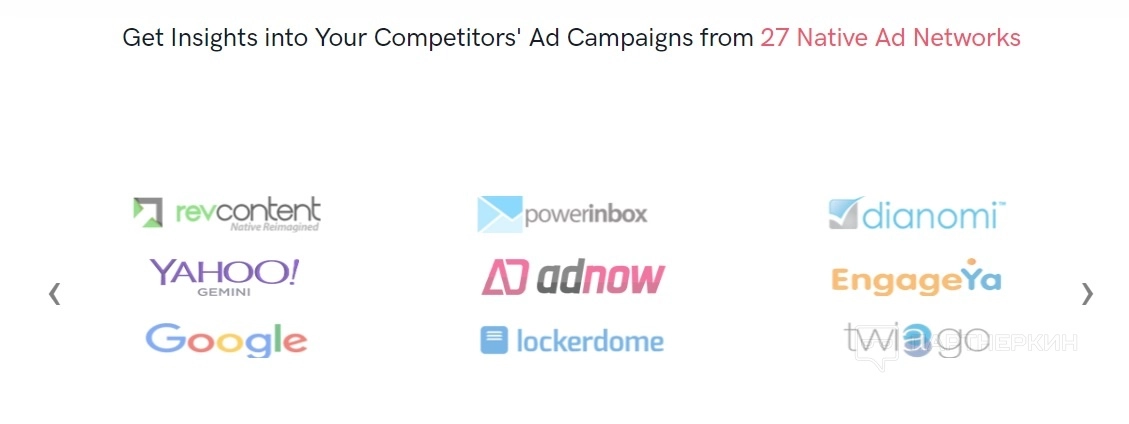 - Поиск и анализ креативов конкурентов по 27 нативным сетям, 38 push-сетям, 32 сетям попсов (Pop Ad Networks).