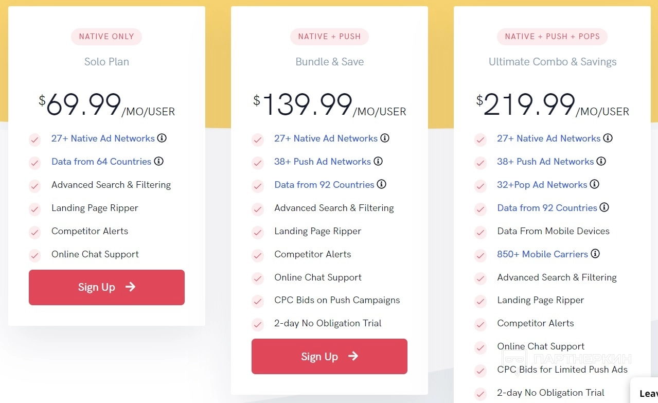 - Тариф Native+Push+Pops за $219,99 в месяц дает все то же самое, что и два предыдущих тарифа, плюс доступ к 32 Pop Ad Networks, данным с мобильных устройств, 850 операторам мобильной связи, ставкам CPC для ограниченных push-объявлений.