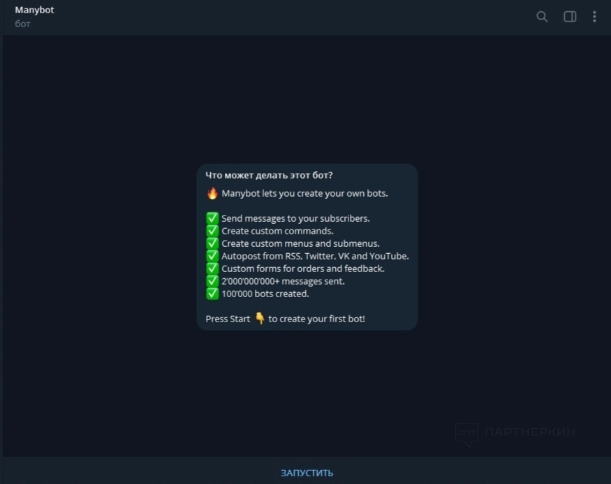 Первым делом необходимо открыть бот в Телеграме. Пользователя автоматически оповестят о возможностях программы в вступительном окошке, после чего можно нажать на кнопку Запустить .
