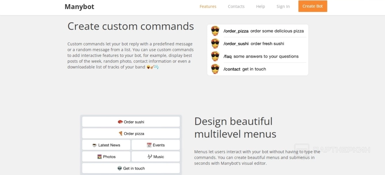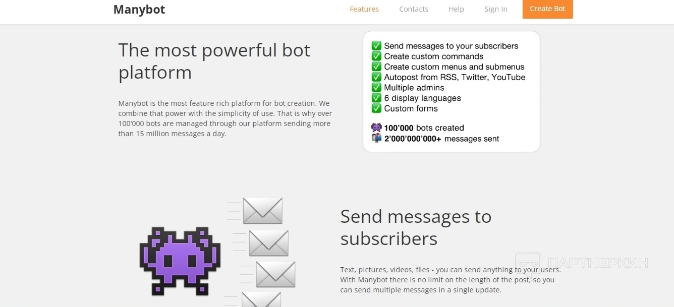 Manybotпредлагает простой и интуитивно понятный интерфейс для создания ботов на базе мессенджера Telegram. Пользователям не обязательно знать основы программирования, а также иметь технические навыки для использования этого сервиса — бот сделает все самостоятельно за несколько минут, главное следовать инструкциям.