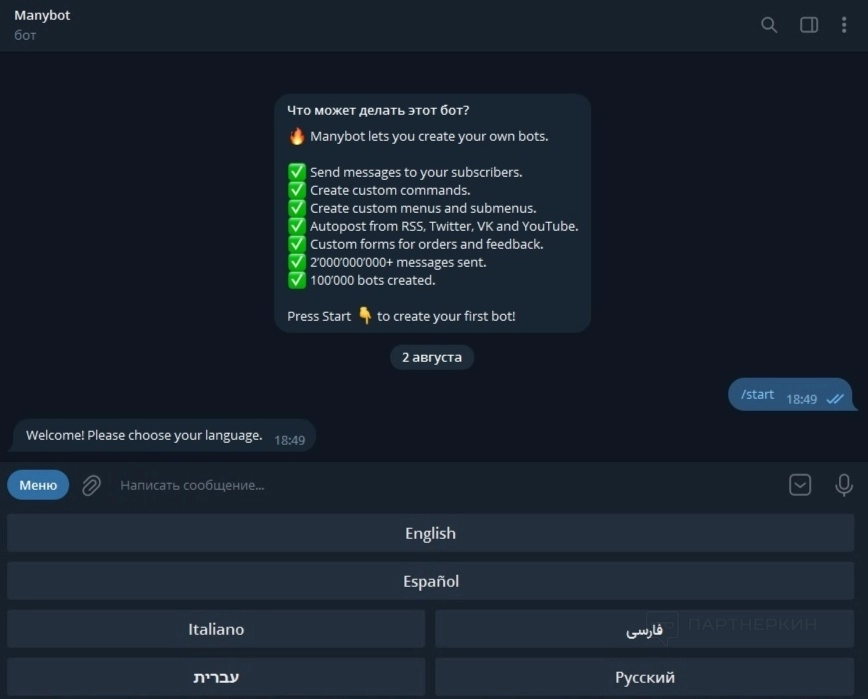 - Поддержка нескольких языков . Возможности бота позволяют поддерживать сразу несколько языков, что делает его доступным для пользователей из разных стран.