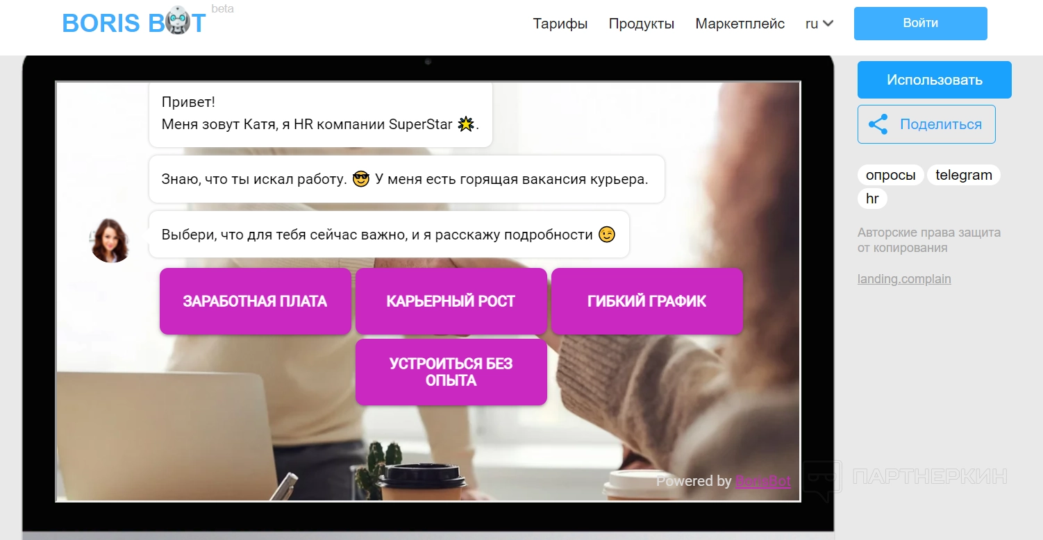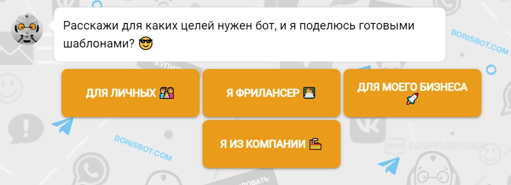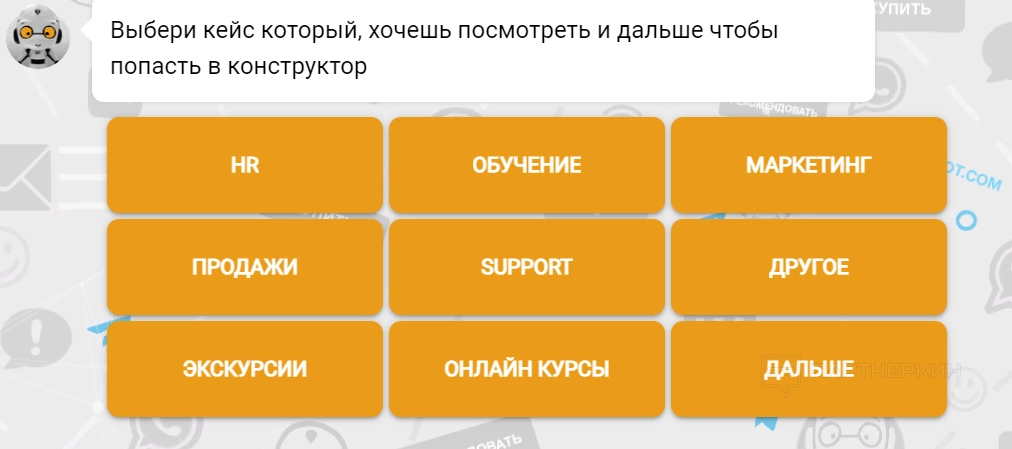 Стоит отметить, что все указанные функции — это всего лишь малая часть возможностей сервиса, предназначенная скорее для формирования базы данных и сопровождения пользователя в процессе покупки. Также можно воспользоваться маркетинговой составляющей проекта, а также условиями и циклами — но медиасодержимое, кроме текста, не поддерживается.