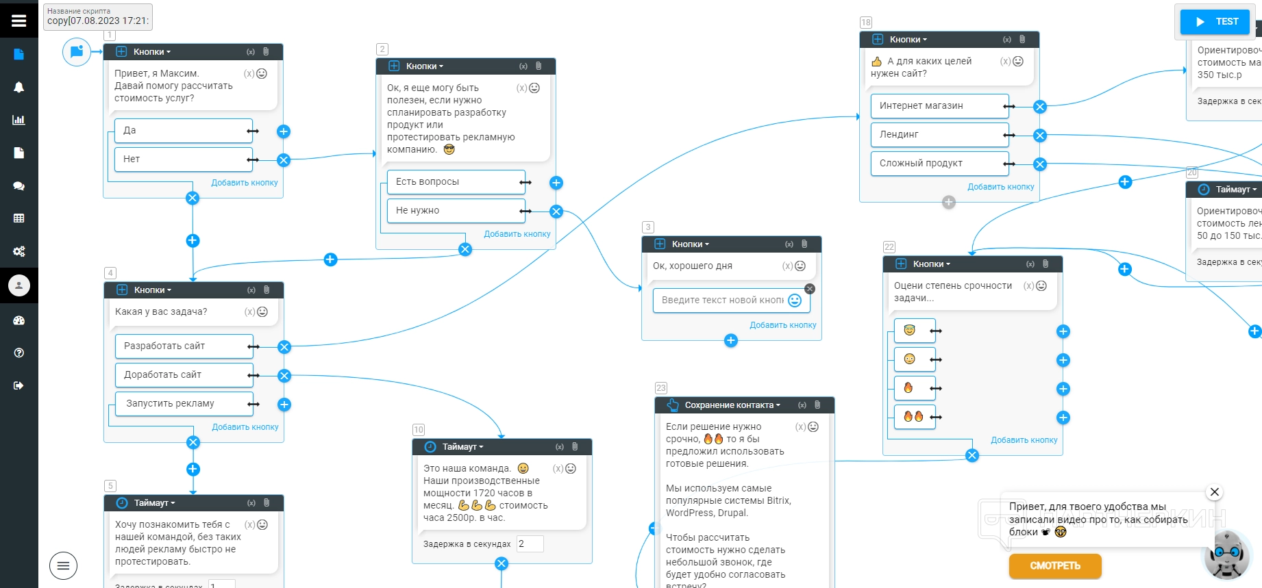 Сам по себе конструктор выполнен в стандартной форме, как это и должно быть: пользователь формирует блоки и составляет логические связи для того, чтобы понимать, что за чем идет. Иначе это называется «блок-схема», и это в разы сложнее, чем иногда предлагают конкуренты (часть сервисов дает возможность пользоваться только заготовленными блоками «Приветствие», «Обработка отказа», «FAQ», и так далее).