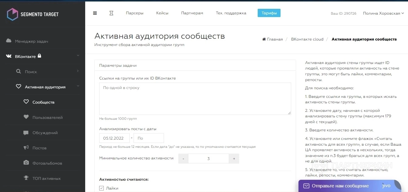 - Активная аудитория — парсер для отслеживания активности среди пользователей по лайкам, комментариям и так далее.