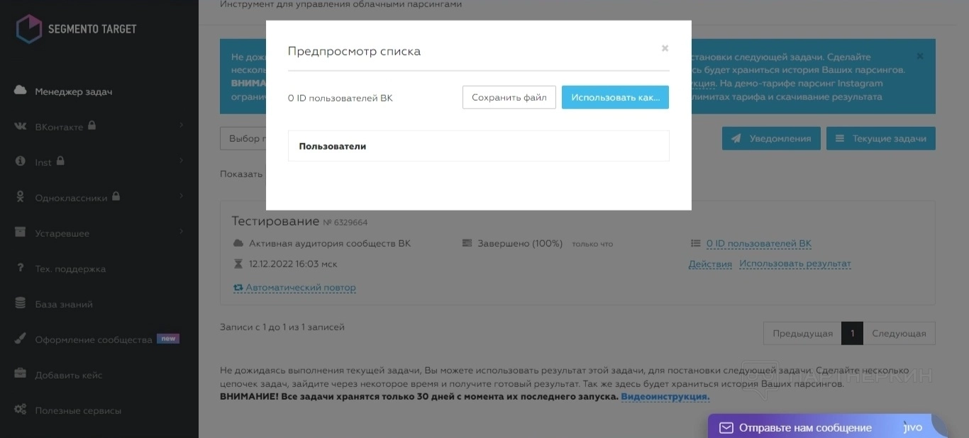 Как только был выполнен последний шаг, пользователя сразу же перебрасывает в уже упоминаемый менеджер задач, в котором можно отслеживать статус выполнения проводимого анализа аудитории. Чем больше будет добавлено ссылок на сообщества в режиме настройки парсера, тем дольше будет выполняться задача. В нашем тестировании была указана лишь одна ссылка, поэтому процесс анализа аудитории прошел достаточно быстро: