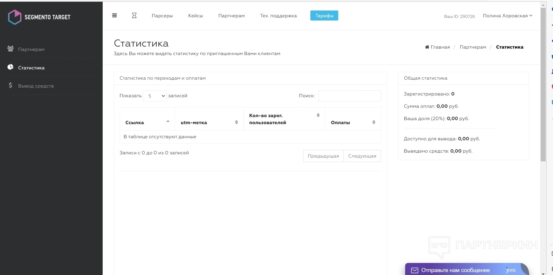 Во втором разделе находится более подробная статистика о своих рефералах, а именно кто по какой ссылке пришел, сколько пользователей зарегистрировались, а сколько нет, какие были сделаны покупки и так далее. Сбоку также можно просмотреть краткие сведения о доступных финансах самого партнера.