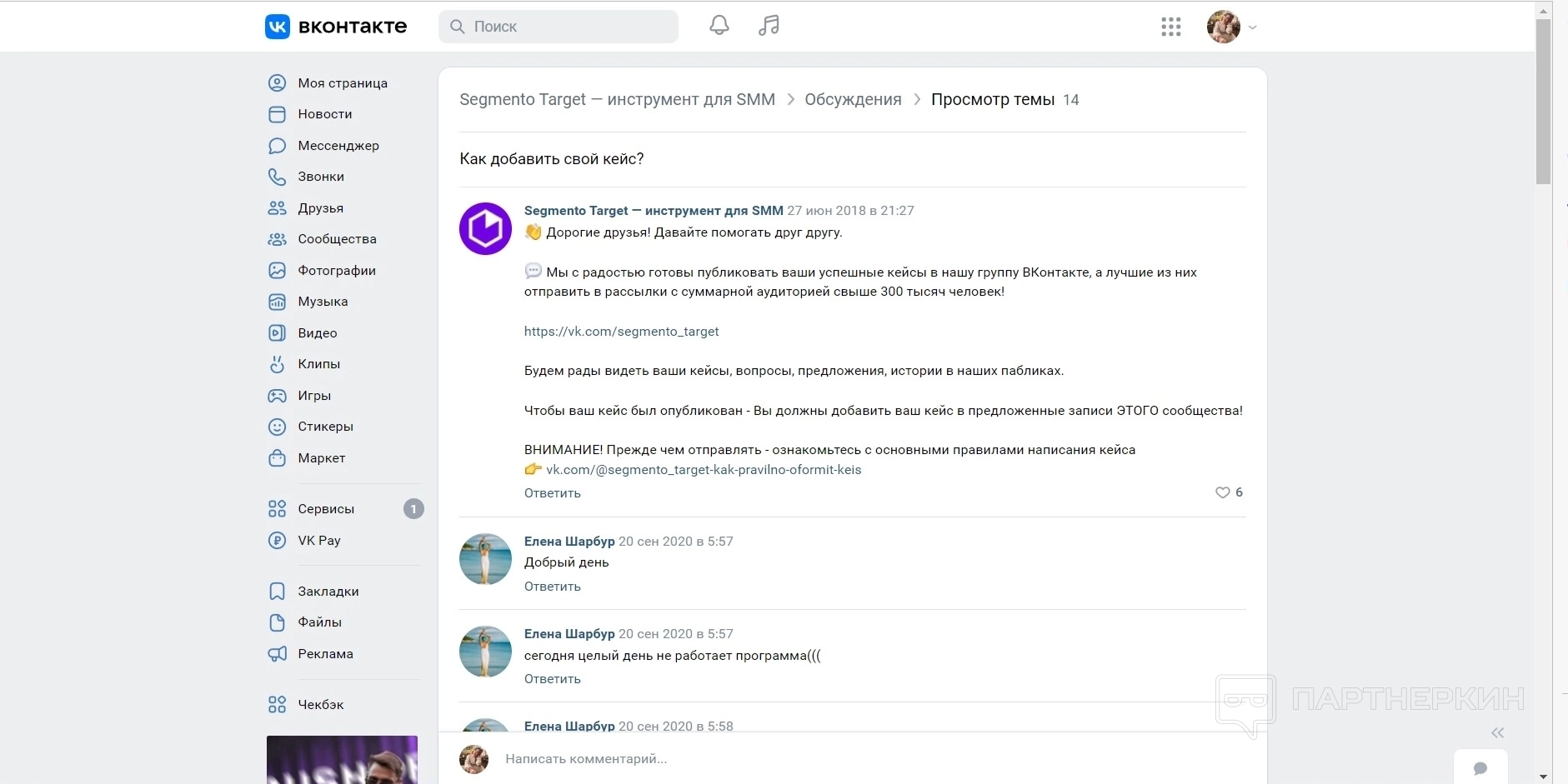 Раздел добавить кейс перенаправляет в группу сервиса в ВКонтакте в соответствующее обсуждение. В нем любой желающий, у которого есть определенные результаты, полученные с помощью данного сервиса, может подать заявку на их публикацию.