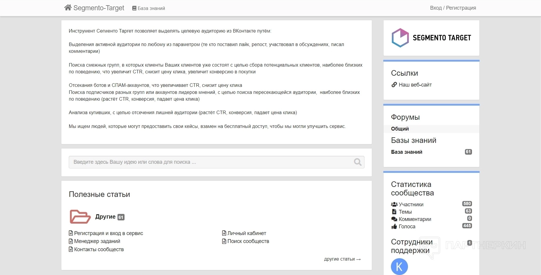База знаний представляет собой отдельно открывающуюся вкладку, в которой собраны все доступные на данный момент инструкции по использованию сервиса. Знания собраны в специальные статьи, которые может прочитать любой зарегистрированный пользователь.