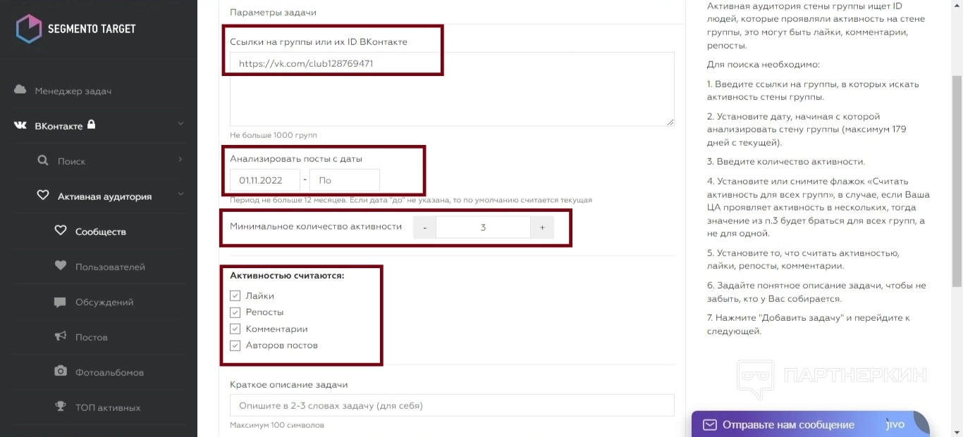 Далее необходимо качественно настроить парсер, чтобы получить правдивые результаты. Для этого заполняем все поля,среди которых обязательно указывается ссылка на сообщество, период времени для анализа активности, минимальное количество активности и ее виды. Чтобы не запутаться в будущем даем краткое описание задачи и создаем новый проект (или добавляем в старый). Последним этапом нажимаем на кнопку «Добавить задачу» внизу страницы: