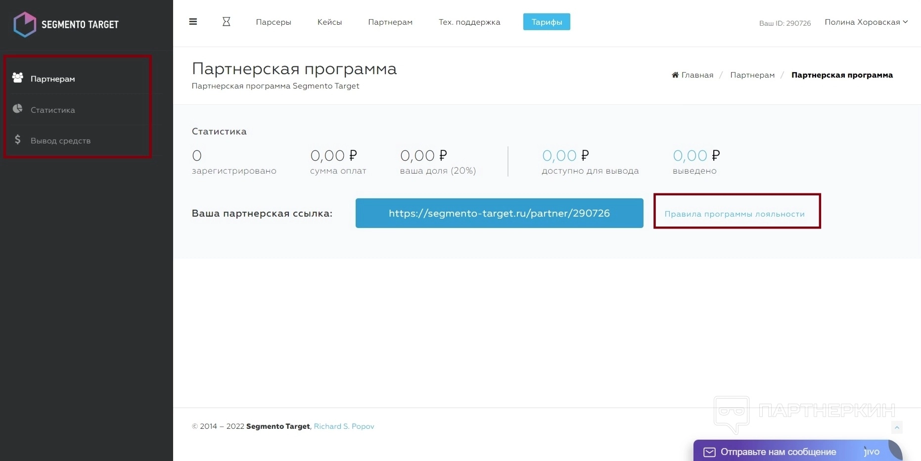 В первом видна краткая информация по зарегистрированным рефералам, на какую сумму они оплатили услуги сервиса и какой процент с этих покупок получит партнер программы. Здесь же можно прочитать о всех правилах участия в партнерской программе.