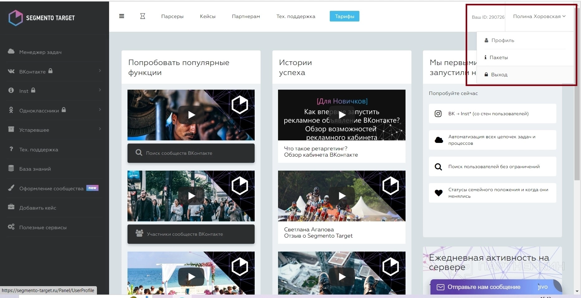 Нажимая на кнопку парсеры пользователь по сути попадает на ту же главную страницу, на которой находятся несколько самых популярных инструментов для работы с аудиториями на разных социальных площадках, а также различные полезные материалы и многое другое.