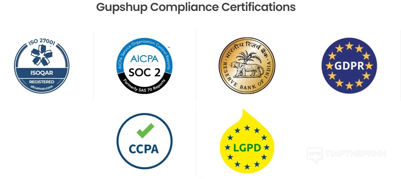 Компания Gupshup сертифицирована по стандарту ISO 27001 и поддерживает метод шифрования SSL TLS 1.2, 256 бит, AES.