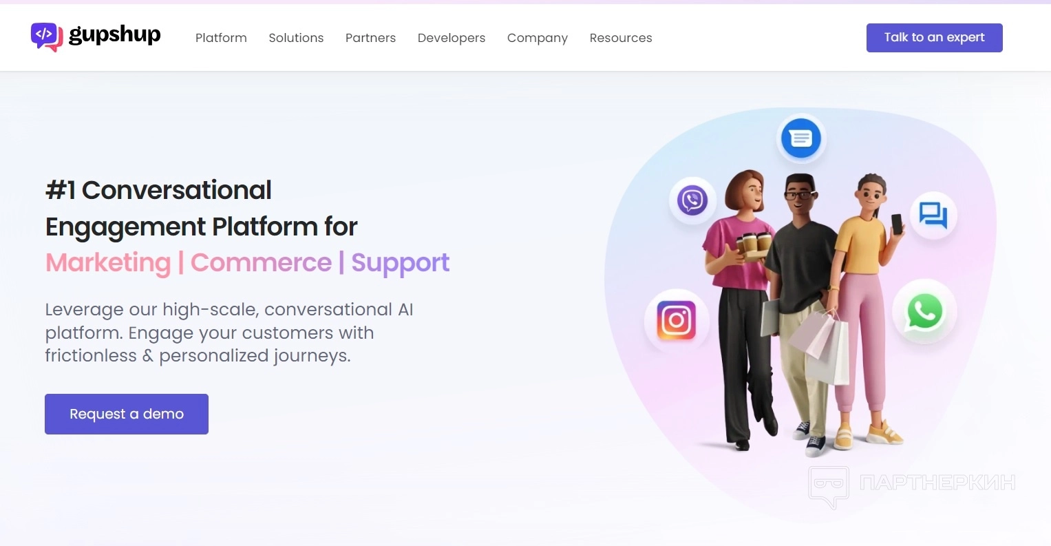 Gupshup.ioпозволяет создавать голосовых ботов и текстовых чат-ботов, внедрять их в маркетинговые кампании, привлекать новых клиентов. Сервис снабжен такими инструментами как интерактивная реклама, менеджер кампаний, которые помогут повысить рентабельность инвестиций и количество конверсий.