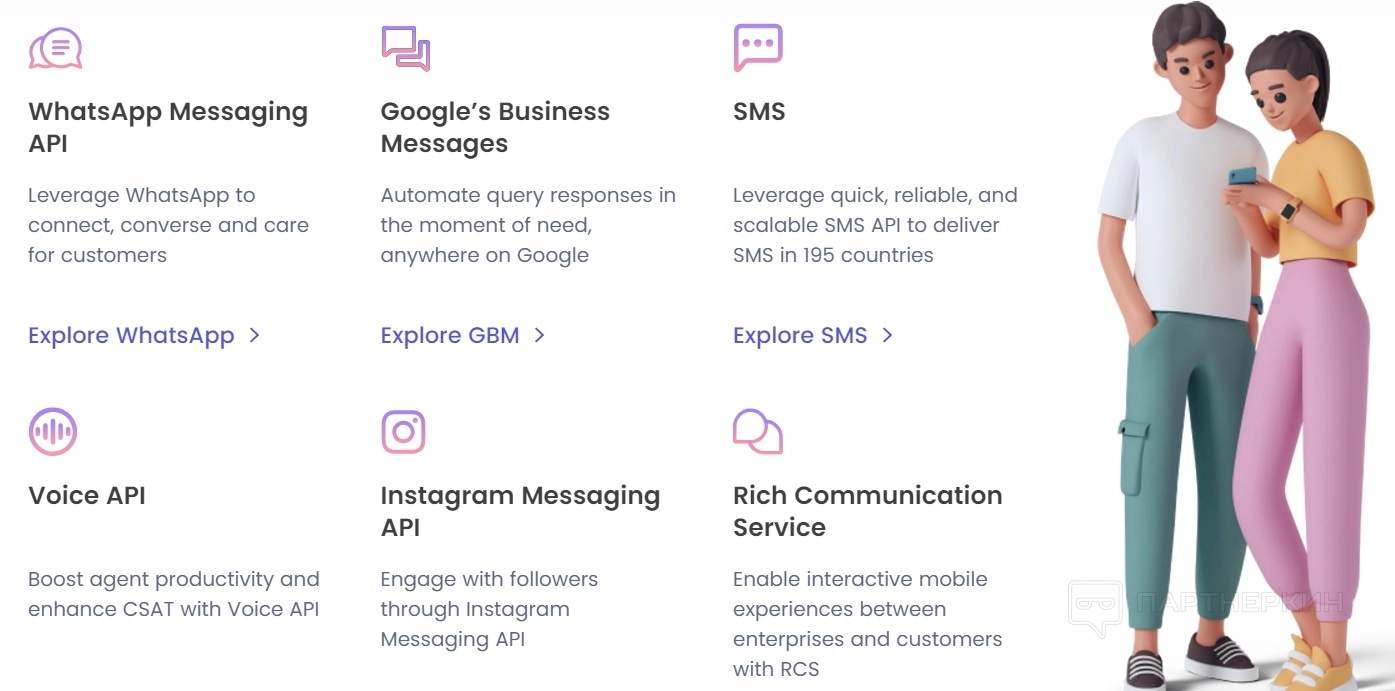 Есть SMS API, который позволяет доставлять SMS в 195 стран. Он отличается высокой надежностью и скоростью. Voice API позволяет повышать производительность агентов и операторов. API обмена сообщениями в Instagram* помогает наладить взаимодействие с подписчиками Инстаграма*.