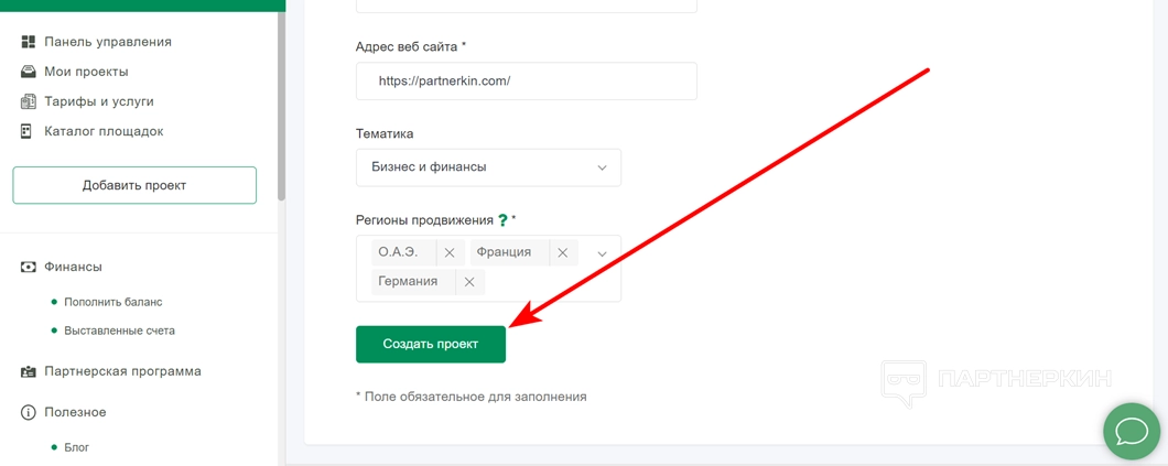 - Укажите название проекта, добавьте адрес веб-сайта, выберите тематику и регионы продвижения.