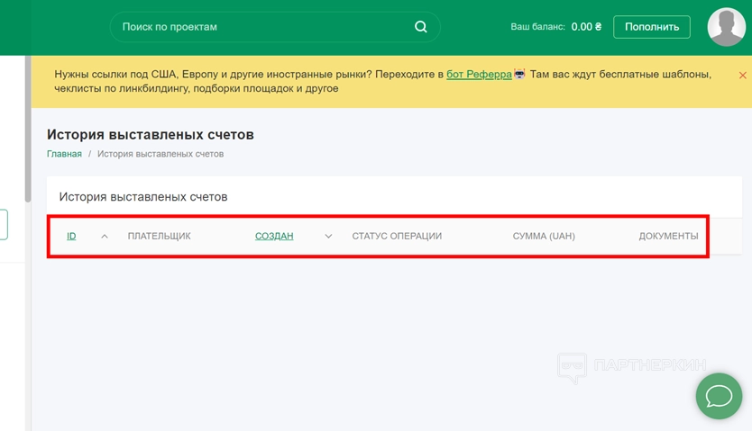 Основной баланс находится в верхнем меню (1). Посмотреть статистику по транзакциям можно в разделе «Финансы» или «Выставленные счета» (2).