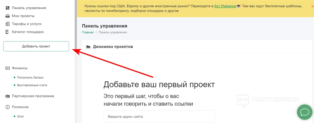 - Панель управления. Создание новых проектов. Управление добавленными рекламными кампаниями.