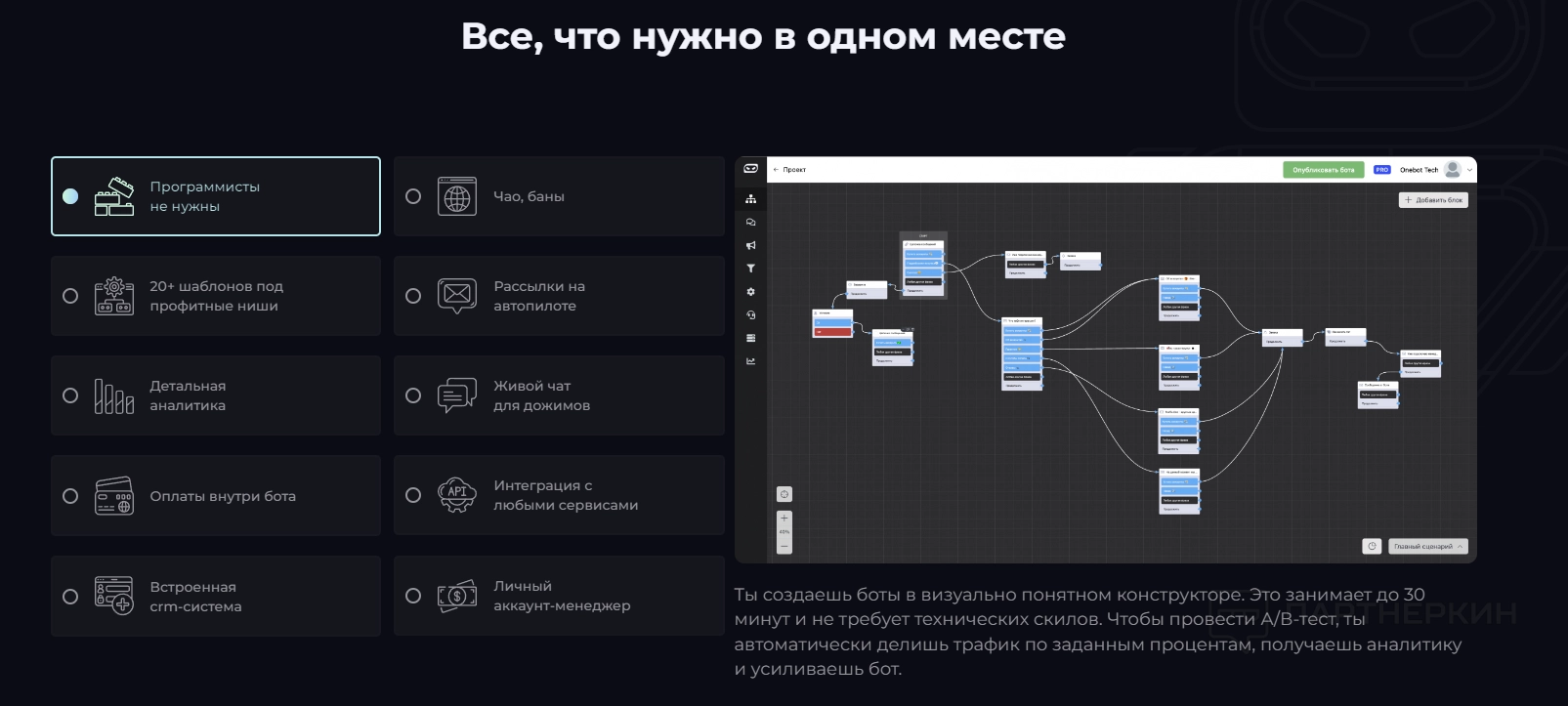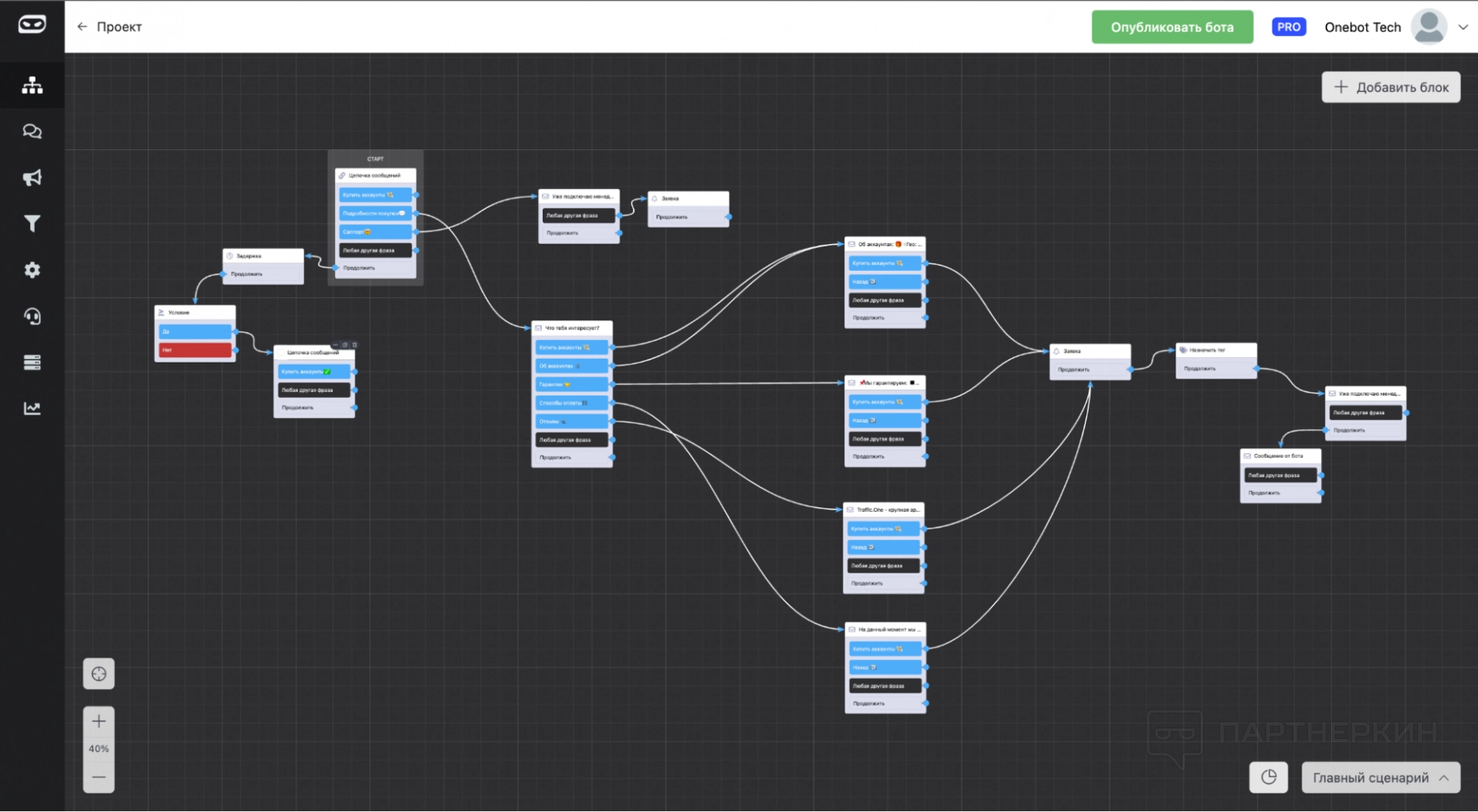 ONE BOT. Через интуитивно понятный интерфейс вы можете создавать сценарии работы чат-бота без программирования. Нужно добавить новый шаг? Пара кликов — и он готов. Такой подход помогает бизнесу быстро адаптировать бота под любые задачи, например, автоматизацию поддержки клиентов или внутренних рабочих процессов.